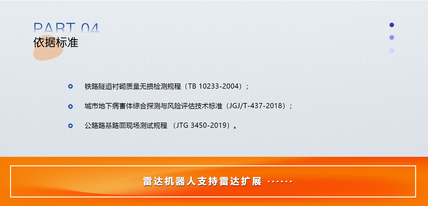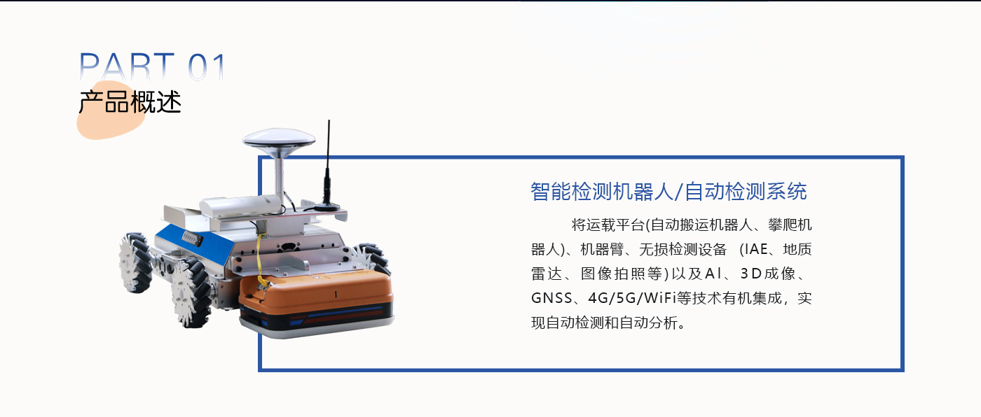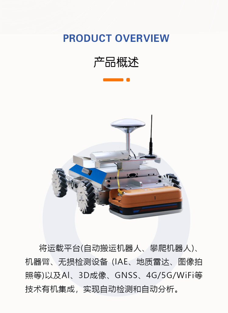 通过搭载平台(AGV,智能检测机器人SIDR-AF-R1)地质雷达)、AI分析、3D成像、4G/5G等技术的有机集成,可实现自主或远程操控行驶、自动检测和自动分析等机能,人而大幅节约人力、提高检测效率、精度和客观性。