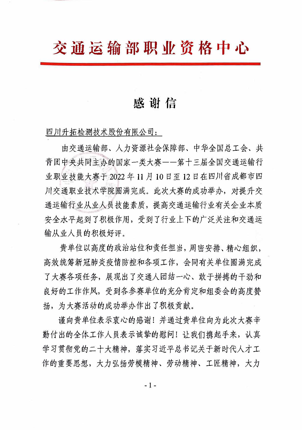 近日,四川升拓检测技术有限公司收到来自交通运输部职业资格中心的感谢信,信中对我公司在全国行业职业技能竞赛——第十三届全国交通运输行业职业技能大赛(国家一类大赛)筹备及举办期间高度的政治站位和责任担当,周密安排、精心组织,高效统筹新冠肺炎疫情防控和各项工作表达了衷心的感谢。这封527字的感谢信,也折射出升拓人的奋进精神与担当本色。四川升拓检测技术股份有限公司作为第十三届全国交通运输行业公路养护工职业技能大赛技术支持单位,为更好地服务国家行业技能大赛,做好赛事支撑工作,决赛前受邀为全国10余个省市的选拔赛(预赛)做技术支持和执裁工作,借助于省市选拔赛平台,为决赛提供技术支持积攒了丰富的经验。助力参加大赛(决赛)选手做足充分准备,为各参赛队伍赛出“匠人”水平,赛出“匠心”风采,提供了有力保障。大赛期间与主办单位保持密切沟通,明确建设目标。在产品研发过程中,不断加大资源投入,创新开发理念,狠抓质量管理。保持高度的企业服务意识、大局意识,高效地保障了全国交通运输行业职业技能大赛的顺利进行。同时,荣获第十三届全国交通运输行业职业技能大赛贡献单位殊荣。 四川升拓检测技术股份有限公司致力土建类工程无损检测、远程监测、智慧工地与智慧养管领域的交通新时代大国工匠技能人才培养与选拔,引领智慧培训在行业内的发展,让技能人才“发光”,为技能强国添彩,持续贡献智慧和力量!