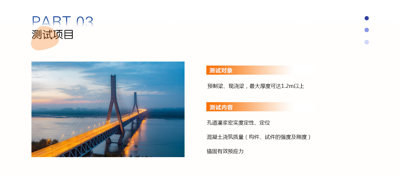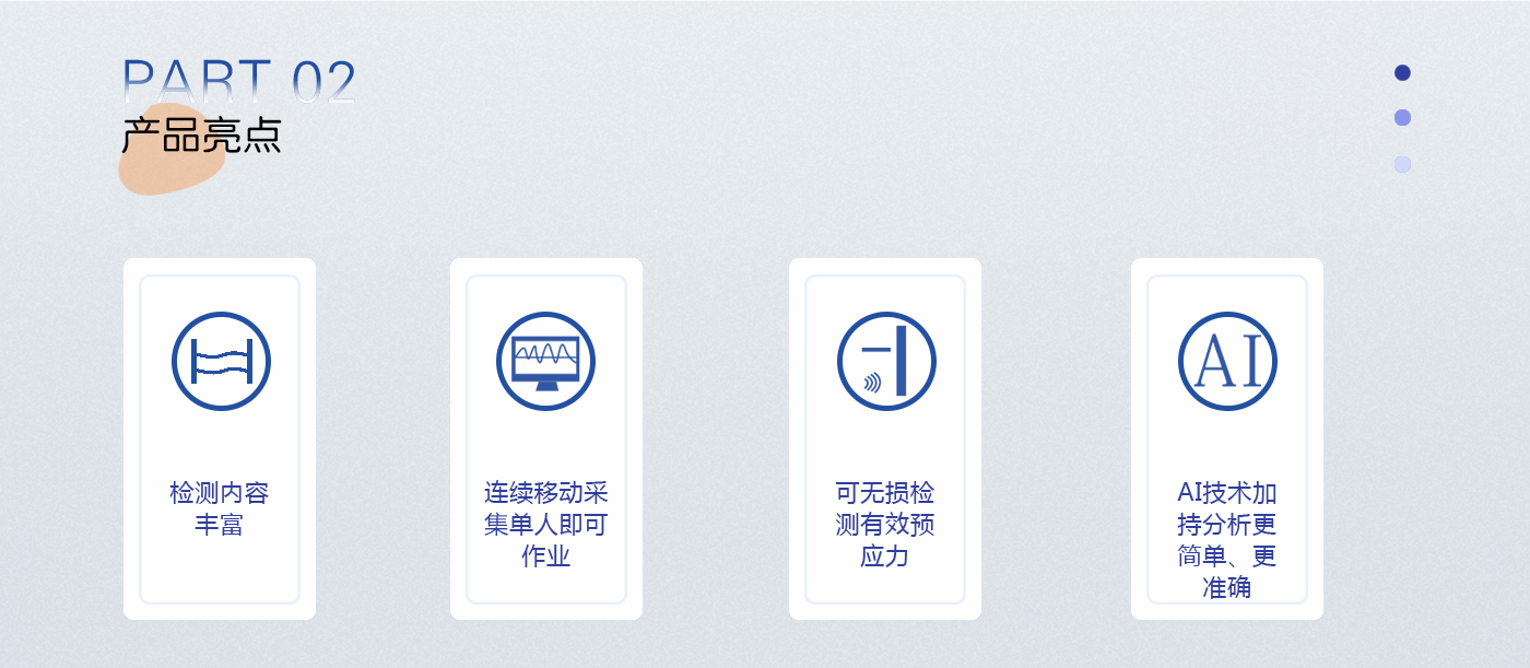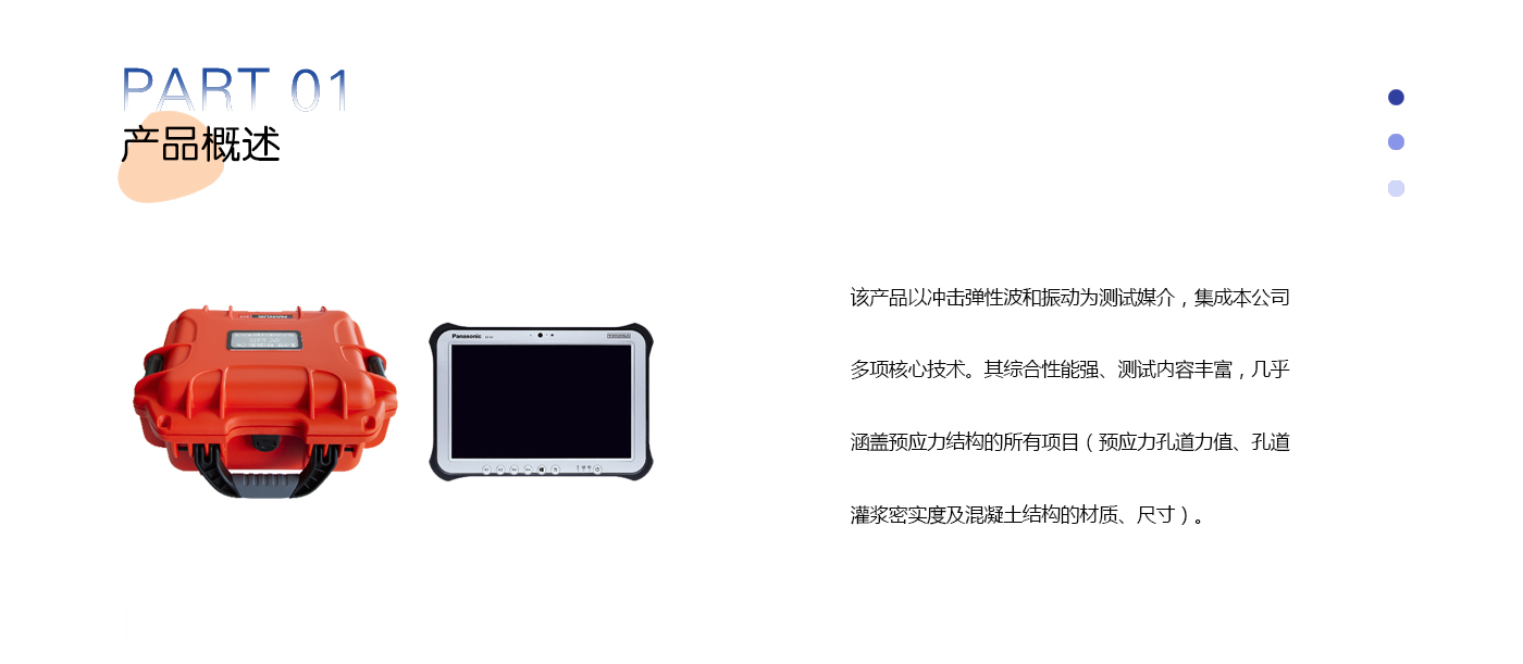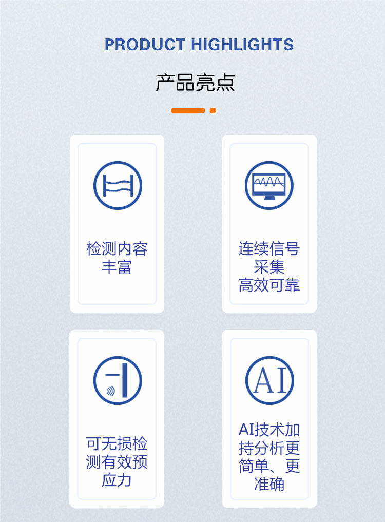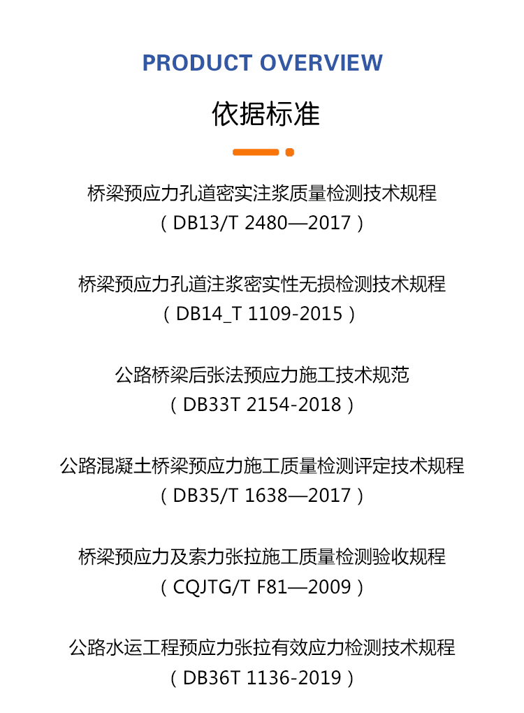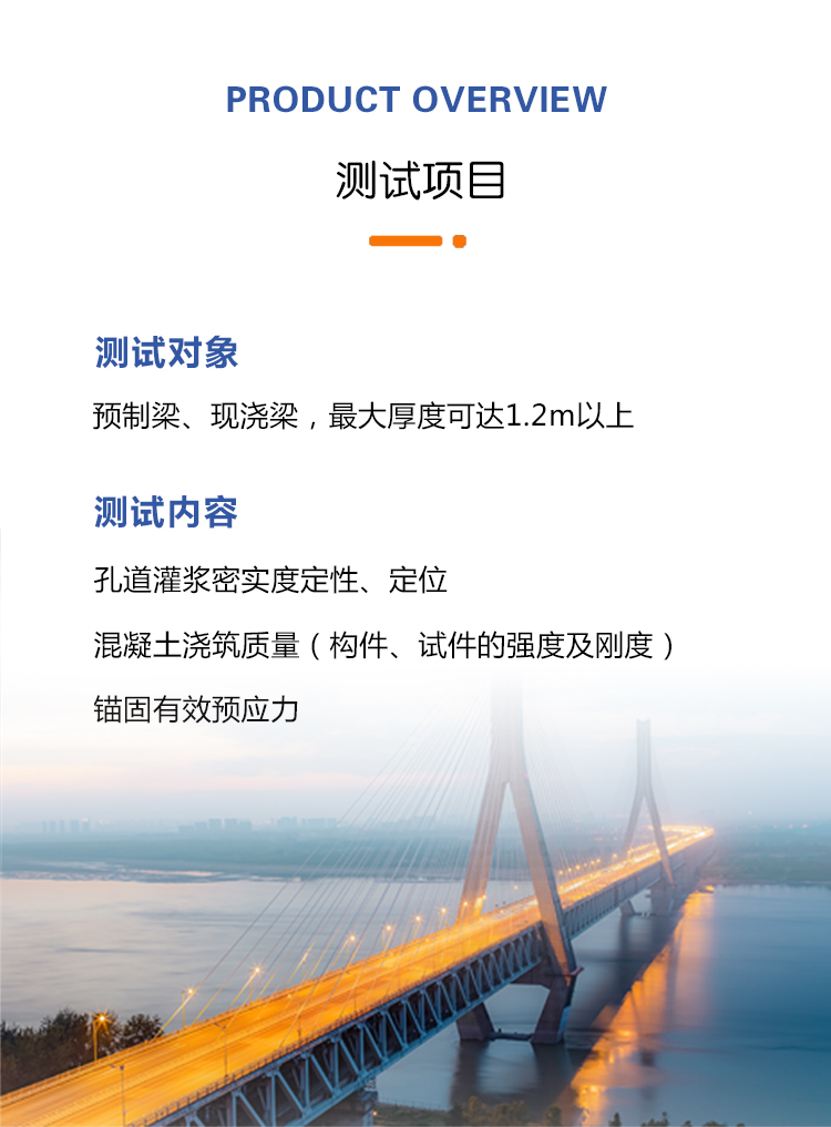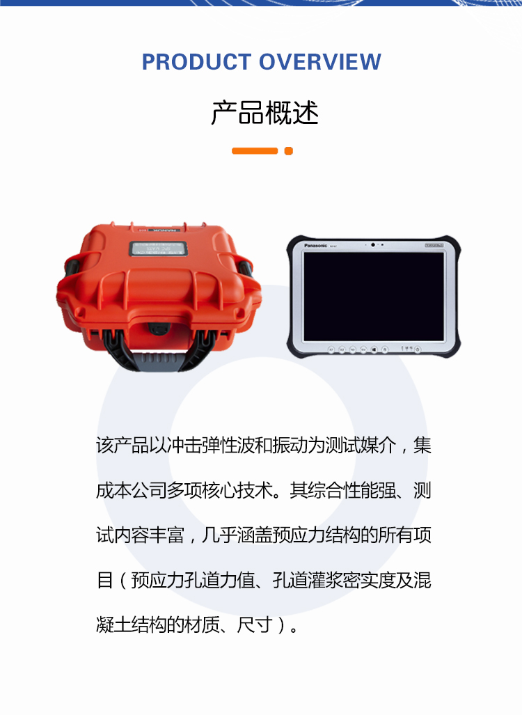 产品以冲击弹性波和振动为测试媒介,集成本公司多项核心技术。其综合性能强、测试内容丰富,几乎涵盖预应力结构的所有项目(预应力孔道力值、孔道灌浆密实度及混凝土结构的材质、尺寸)。