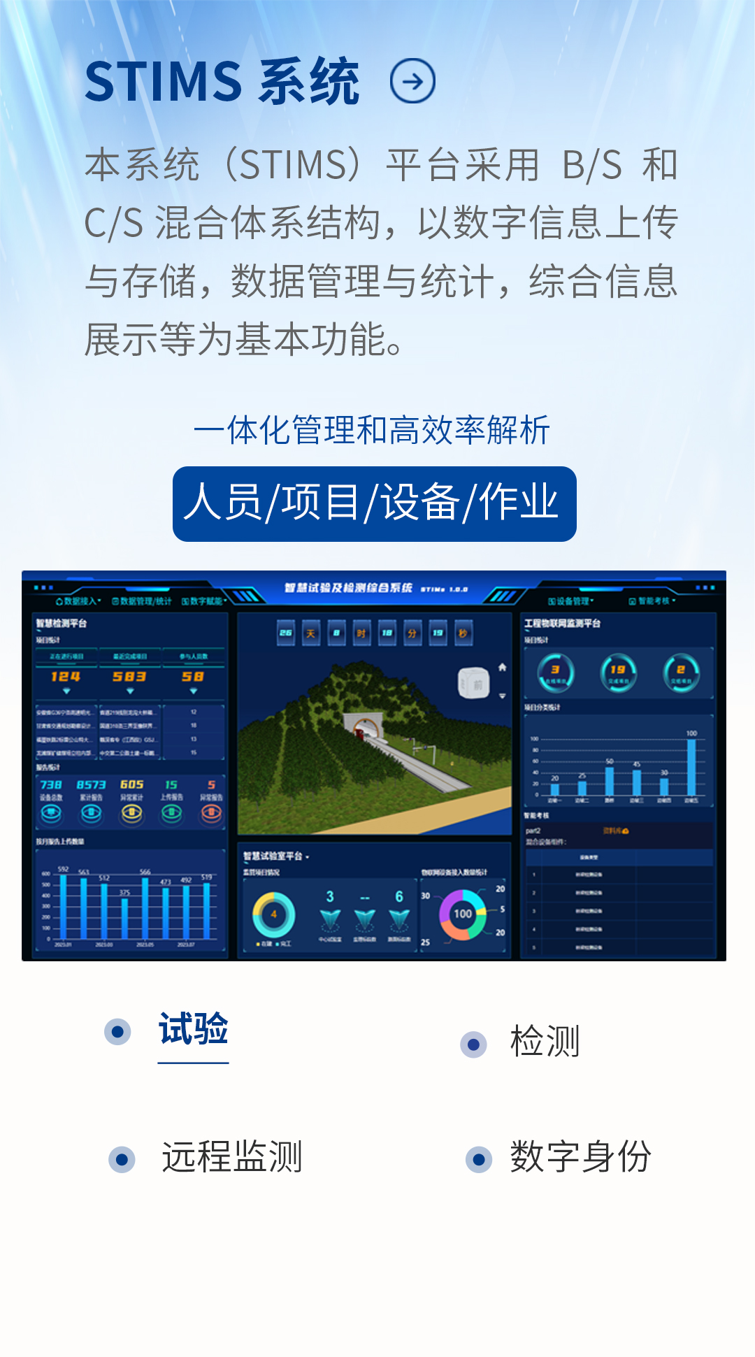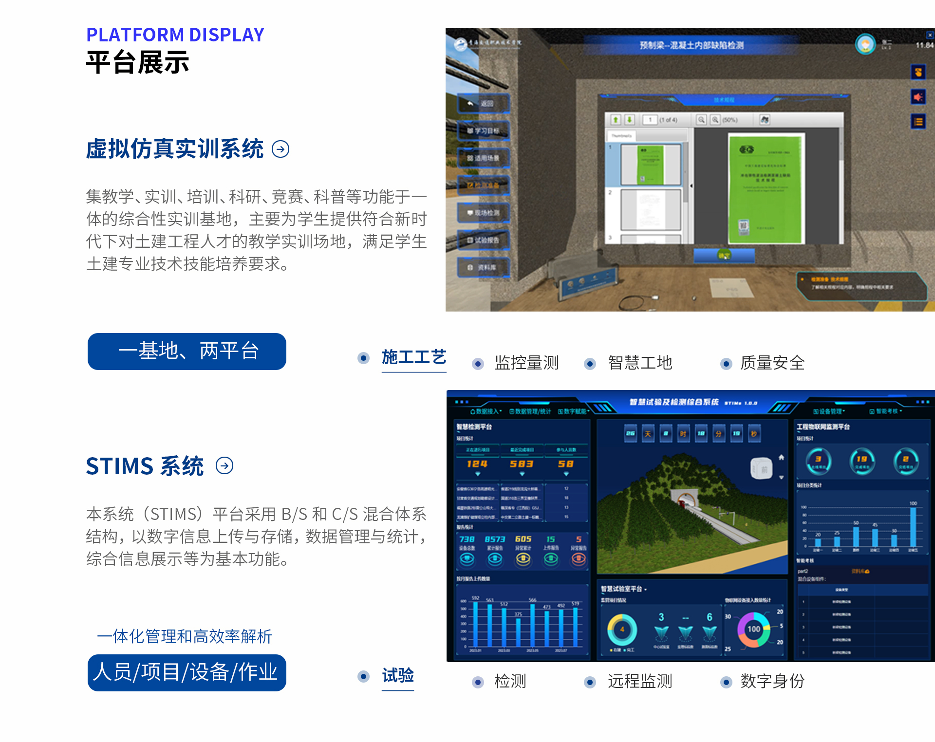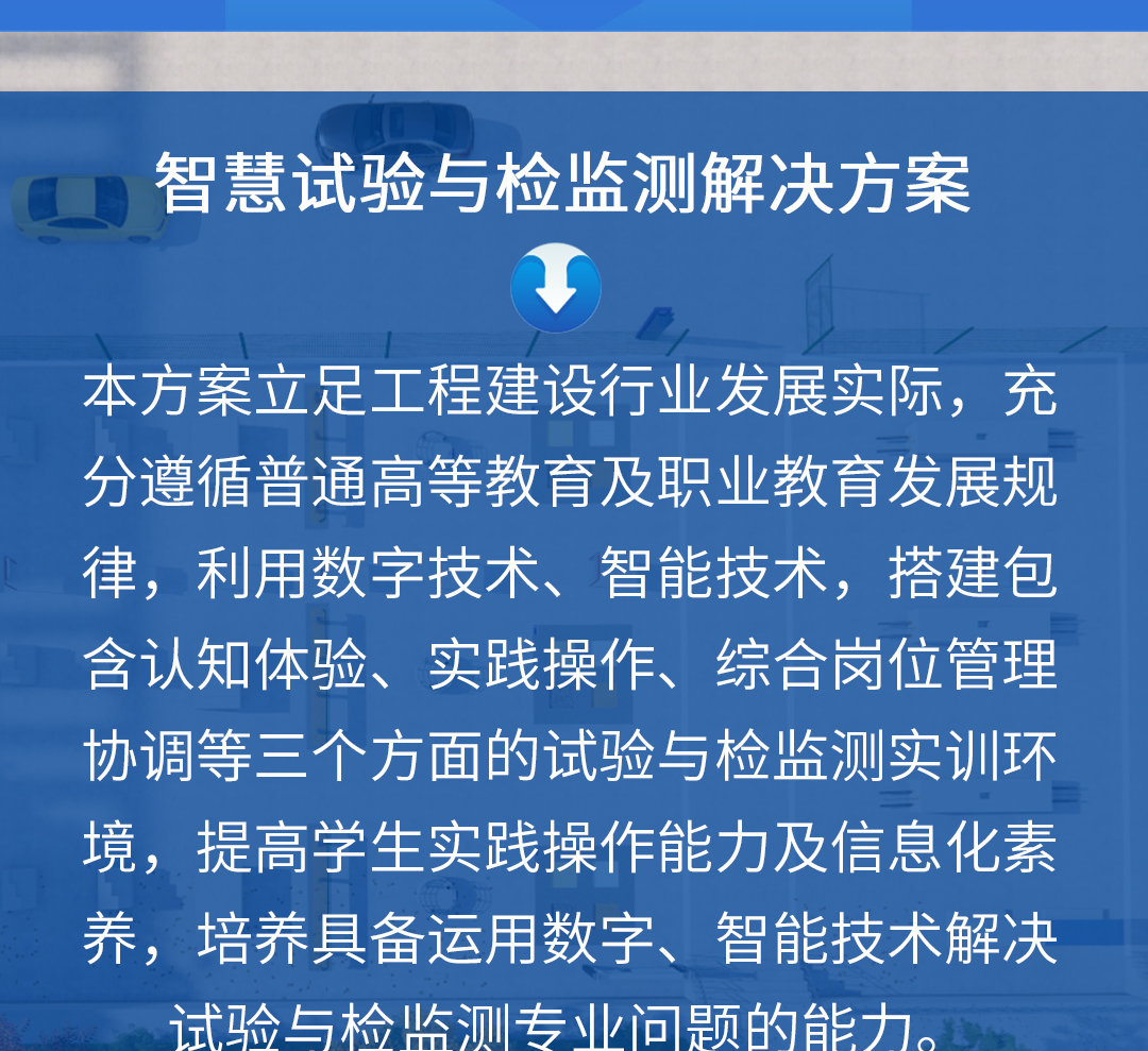 认知体验、实践操作、综合岗位管理协调等三个方面的试验与检监测实训环境,提高学生实践操作能力及信息化素养,培养具备运用数字、智能技术解决试验与检监测专业问题的能力。